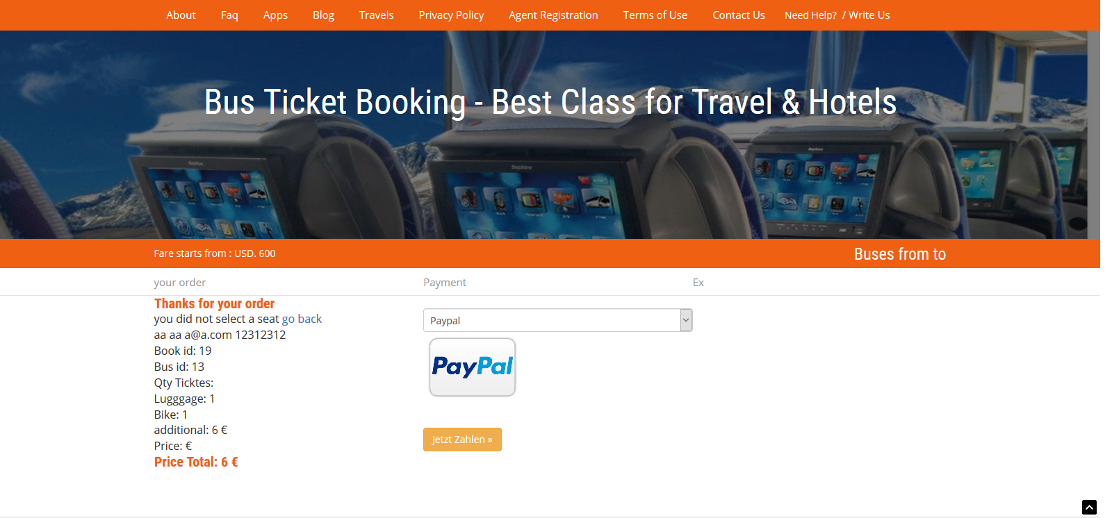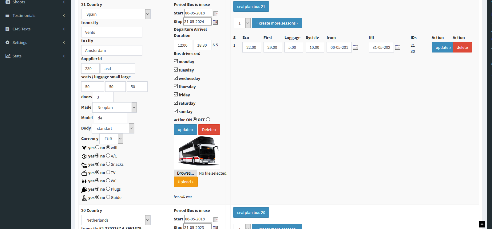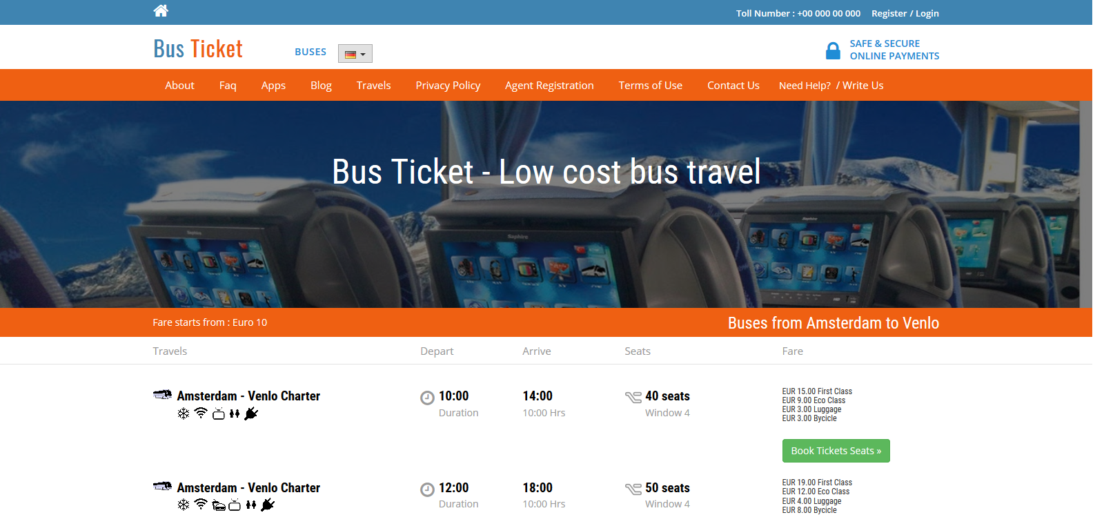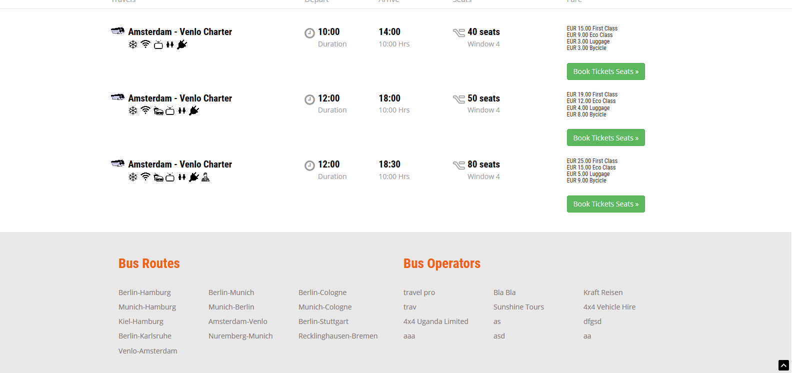 Complete turn key ready script to run a Bus Ticket Order booking Portal on your location or worldwide. Suppliers can sign up / in to their own admin area and add their offers. Orders are send to client, supplier, admin. Use it for your own bus fleet or run it as an open portal for suppliers ... With Seat reservation system and bus seat plan creator ... Usable to offer bus transport all over the world, in many languages and currencies, all can be customized ...and is include an App for smart phone.