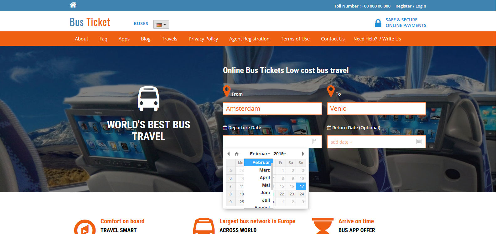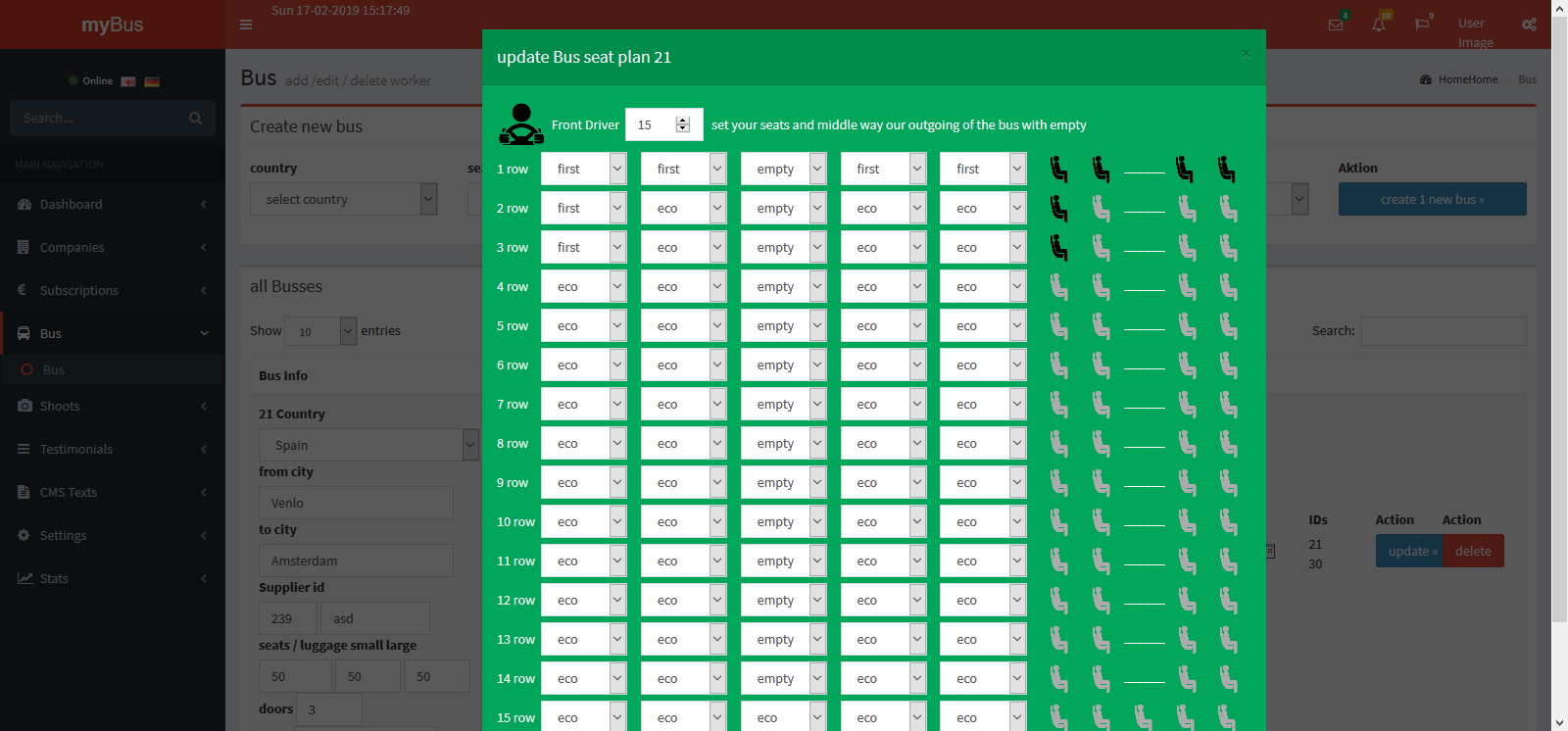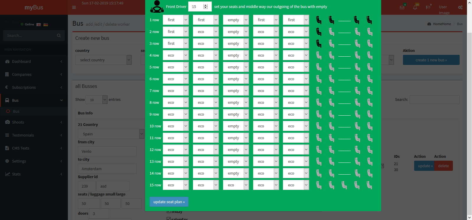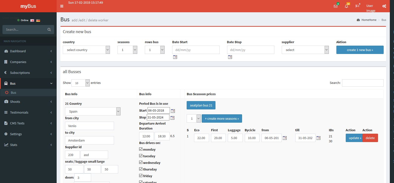 Complete turn key ready script to run a Bus Ticket Order booking Portal on your location or worldwide. Suppliers can sign up / in to their own admin area and add their offers. Orders are send to client, supplier, admin. Use it for your own bus fleet or run it as an open portal for suppliers ... With Seat reservation system and bus seat plan creator ... Usable to offer bus transport all over the world, in many languages and currencies, all can be customized ...and is include an App for smart phone.